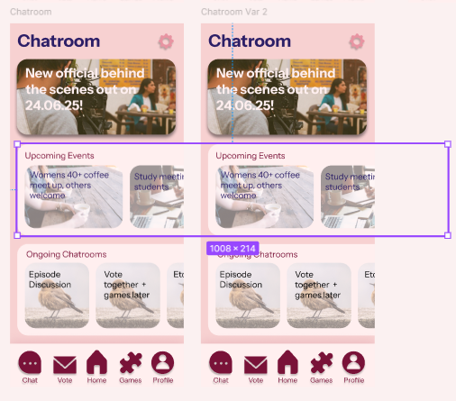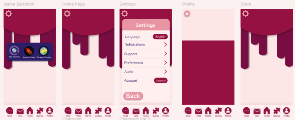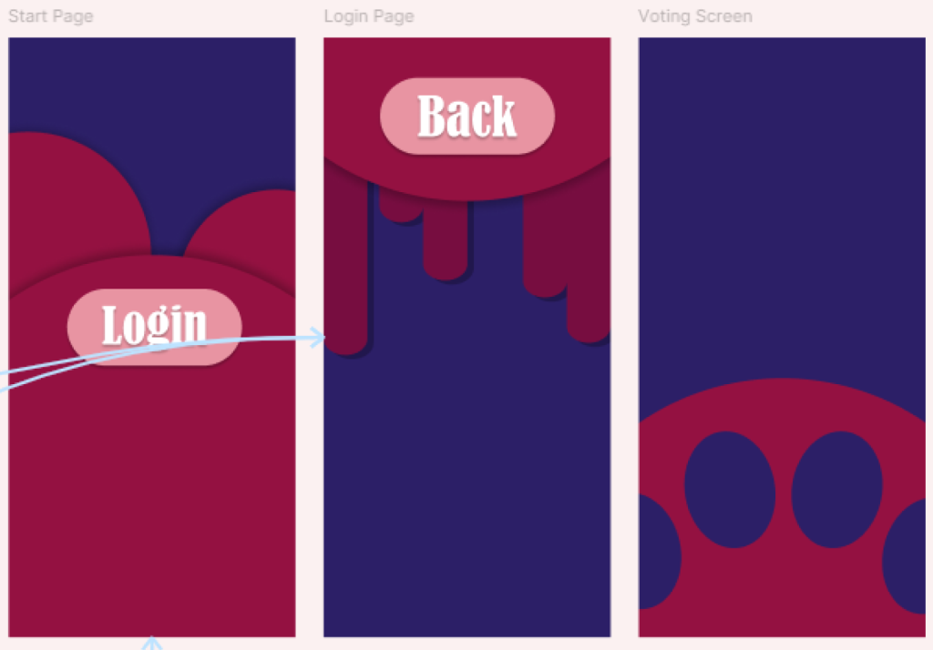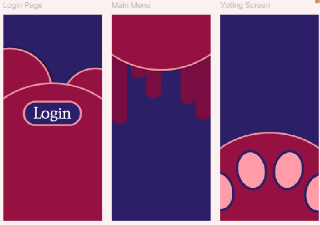 While making my prototype, I started with a base outline of the wireframe structure, including the homepage, settings page, login page, decision page and chatroom. Next, I chose a colour scheme based on my prior research on Traitors and other mobile companion apps which use darker colours for a more serious tone, however over my development as I tested out candy-crush style buttons and couldn’t see a way for them to work with the style I was going for I ended up changing this later to push for a more light-hearted and corporate atmosphere which would be more approachable for users while leaving the mystery aspect to the show.